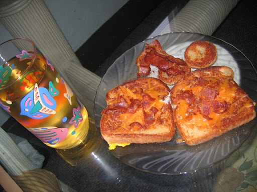 These little treats are buttered bread with the centers cut out, replaced with an egg (centers broken, as Tiffany preferred them) and then cheese and bacon to top it off. Some bacon and I grilled up the centers as well. Might as well not let them go to waste ya know!